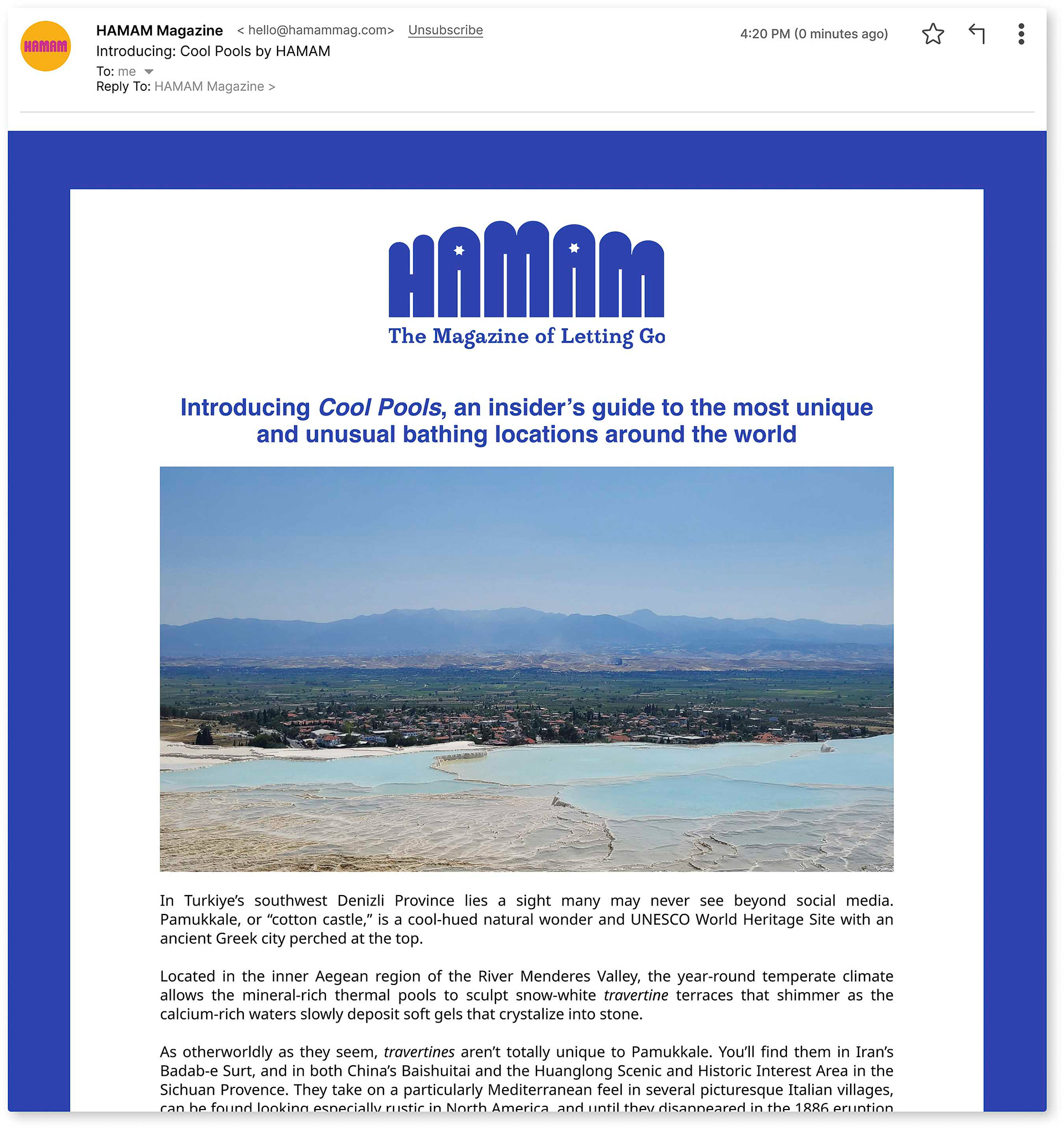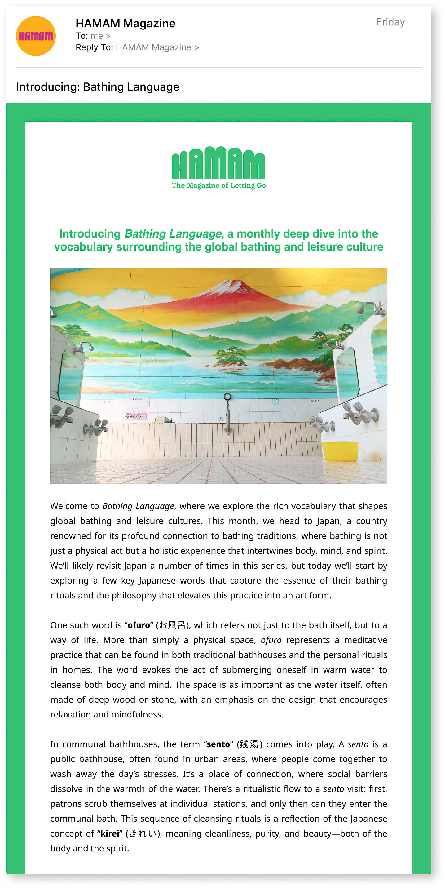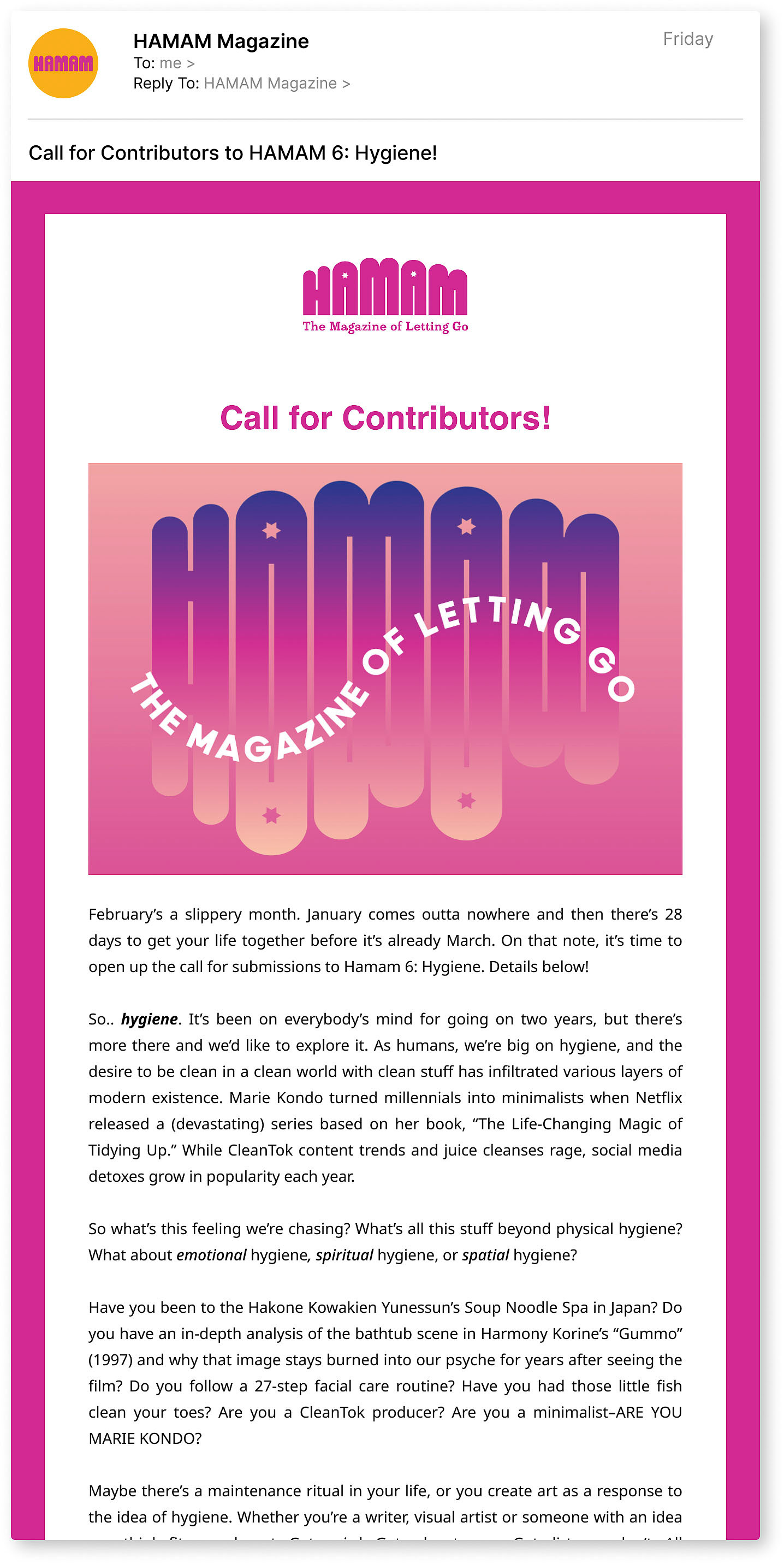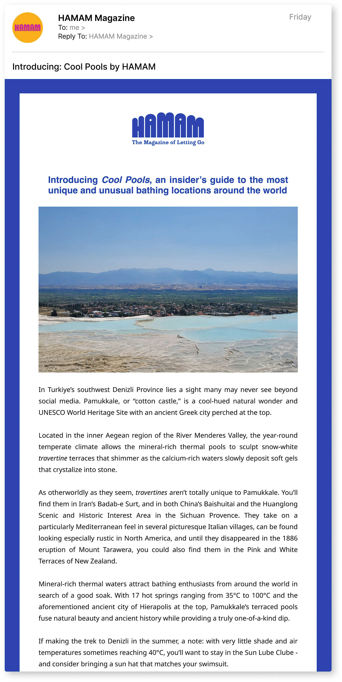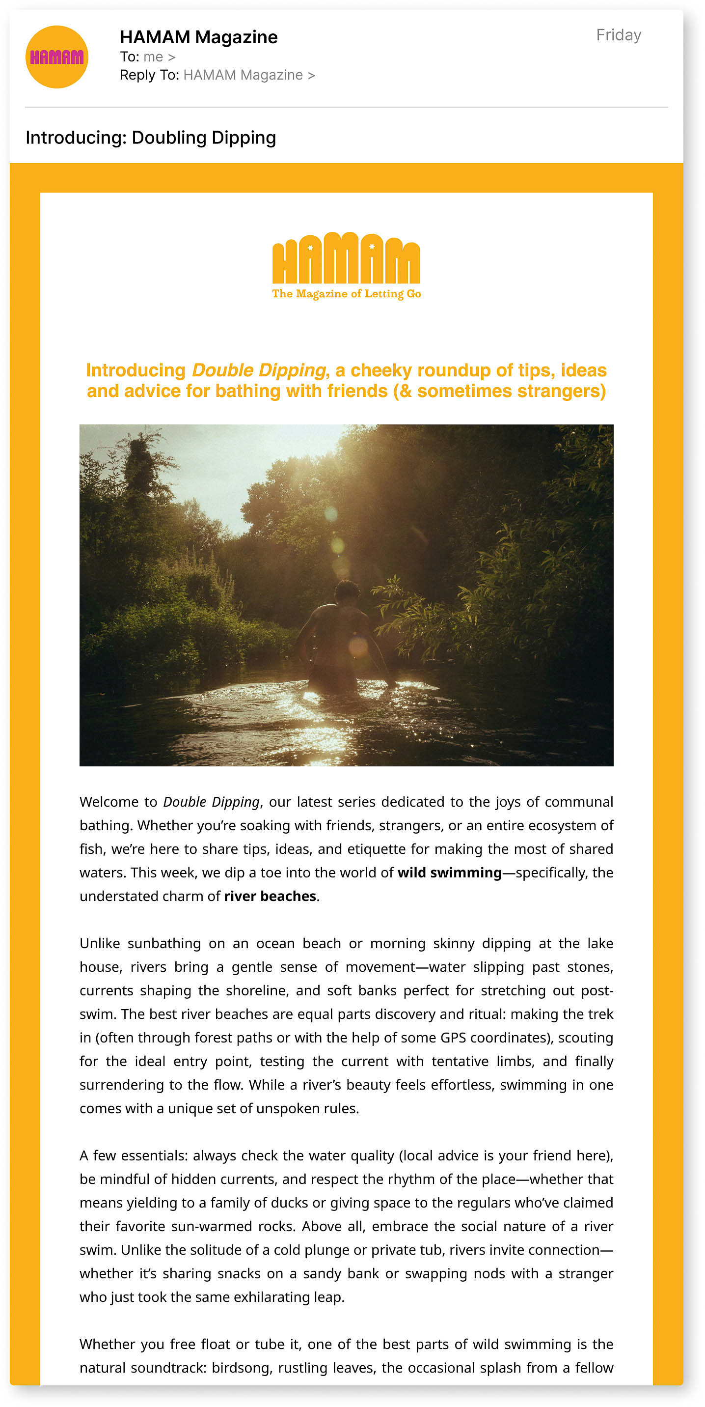 I worked with print-only bathing magazine Hamam to build a tailored creative toolkit to help the mag stay afloat between issues and promote past editions. The gist was “niche magazine has limited budget, seeks good ideas to use later," so I developed a series of dynamic social media campaigns, newsletter themes and daily posts to highlight individual articles, expand on bathing themes and explore bathing-adjacent content.